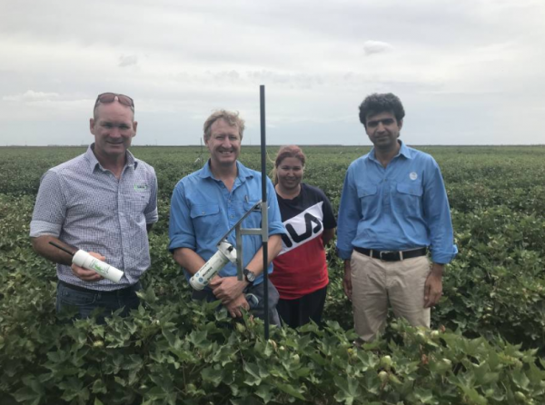 Pictured: Tom Dowling from Goanna Ag holding the new temperature sensor, with CSIRO researchers Michael Bange, Victorial Smith and Hiz Jamali. Photo courtesy FarmOnline.